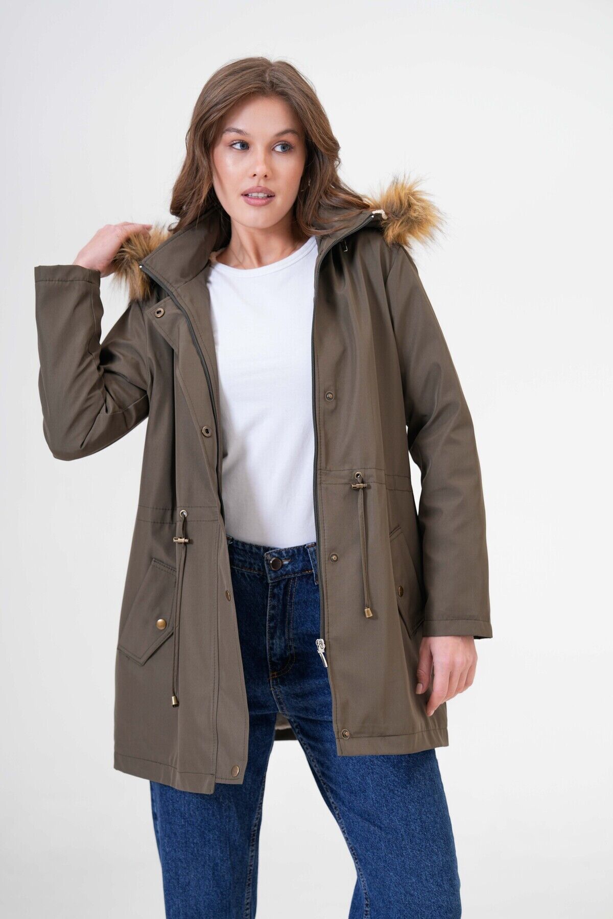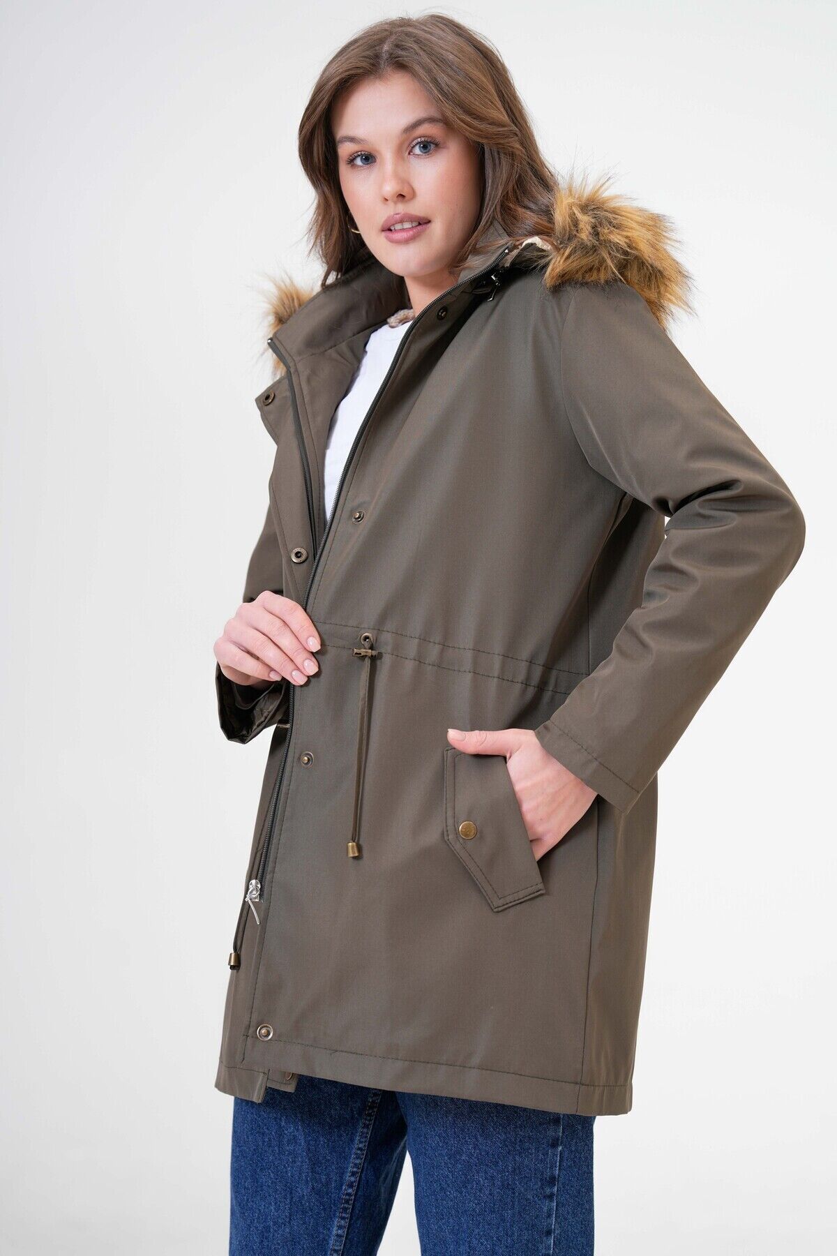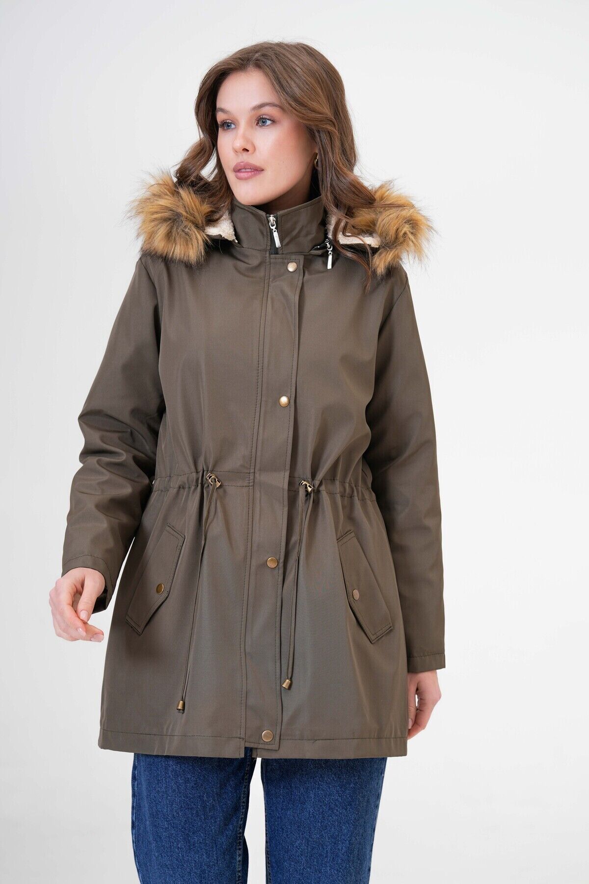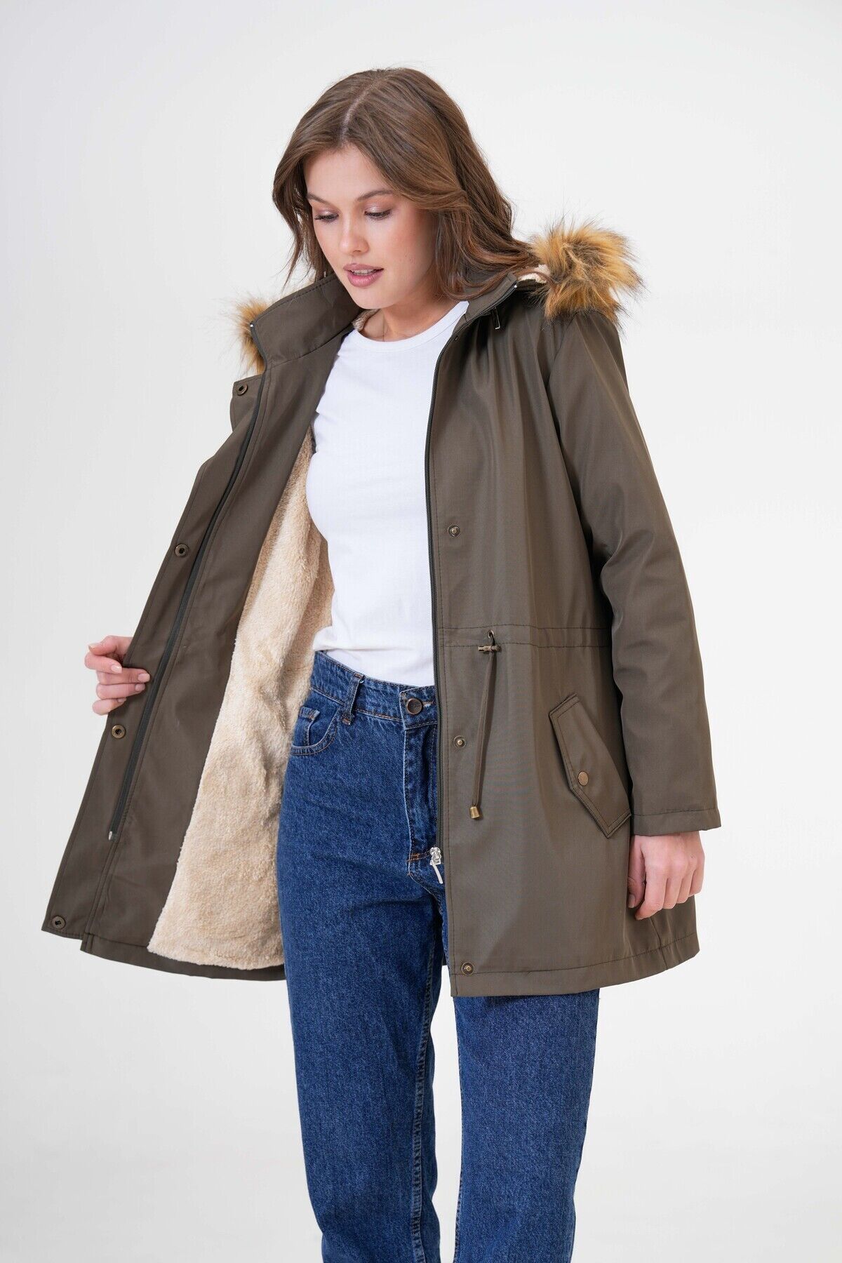 - Su itici özelliği ile yağmurlu havalarda bile konforlu bir kullanım sunar.; - İç kısmındaki kürk detayları, soğuk günlerde ekstra sıcaklık sağlar.; - Beli büzgülü tasarımı sayesinde vücut hatlarınıza uyum sağlayarak şık bir görünüm kazandırır.; - Kapüşonlu yapısı ile başınızı ve boynunuzu rüzgar ve yağıştan korur.; - Çift cepli tasarım pratik eşyalarınız için kolay erişim imkanı tanır.; - Çıtçıtlı kapama mekanizması hızlı ve güvenli bir şekilde giyilip çıkarılmasını mümkün kılar.; - Kalın yapısıyla kış aylarında üstün ısı yalıtımı sunarken, haki rengiyle zamansız bir stil oluşturur.; - Cool & comfort persona'sına sahip bu mont, günlük kullanımda rahatlıkla tercih edilebilir.; - Baskısız düz deseniyle sade ve zarif bir görünüm sergilerken, her türlü kombinle uyum içindedir.; - Uzun kollu tasarım soğuktan tam koruma sağlarken, peluş dokusu yumuşaklık hissi verir.; - Düz kesimiyle sadelikten yana olanların tercihi olacak şekilde dizayn edilmiştir.