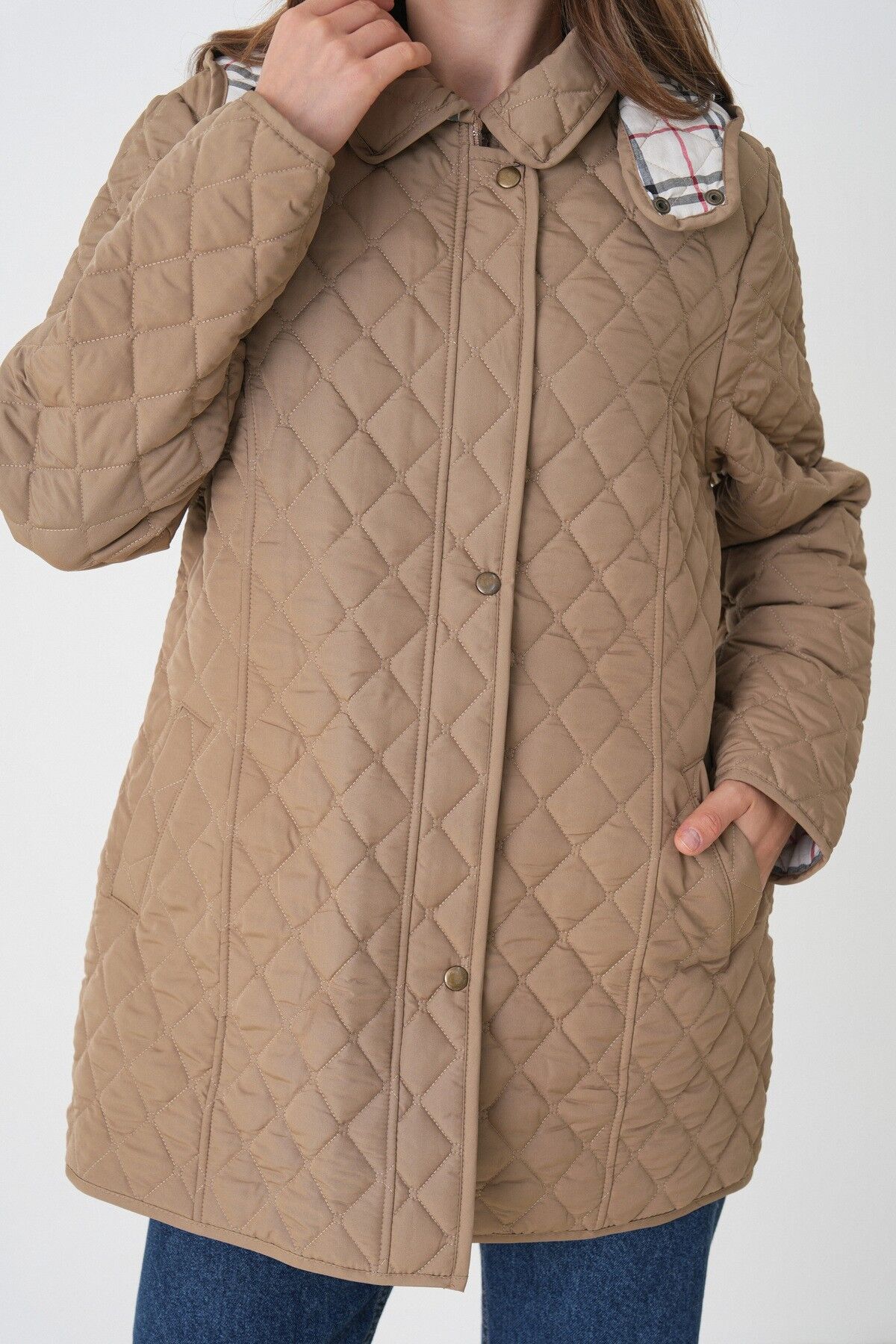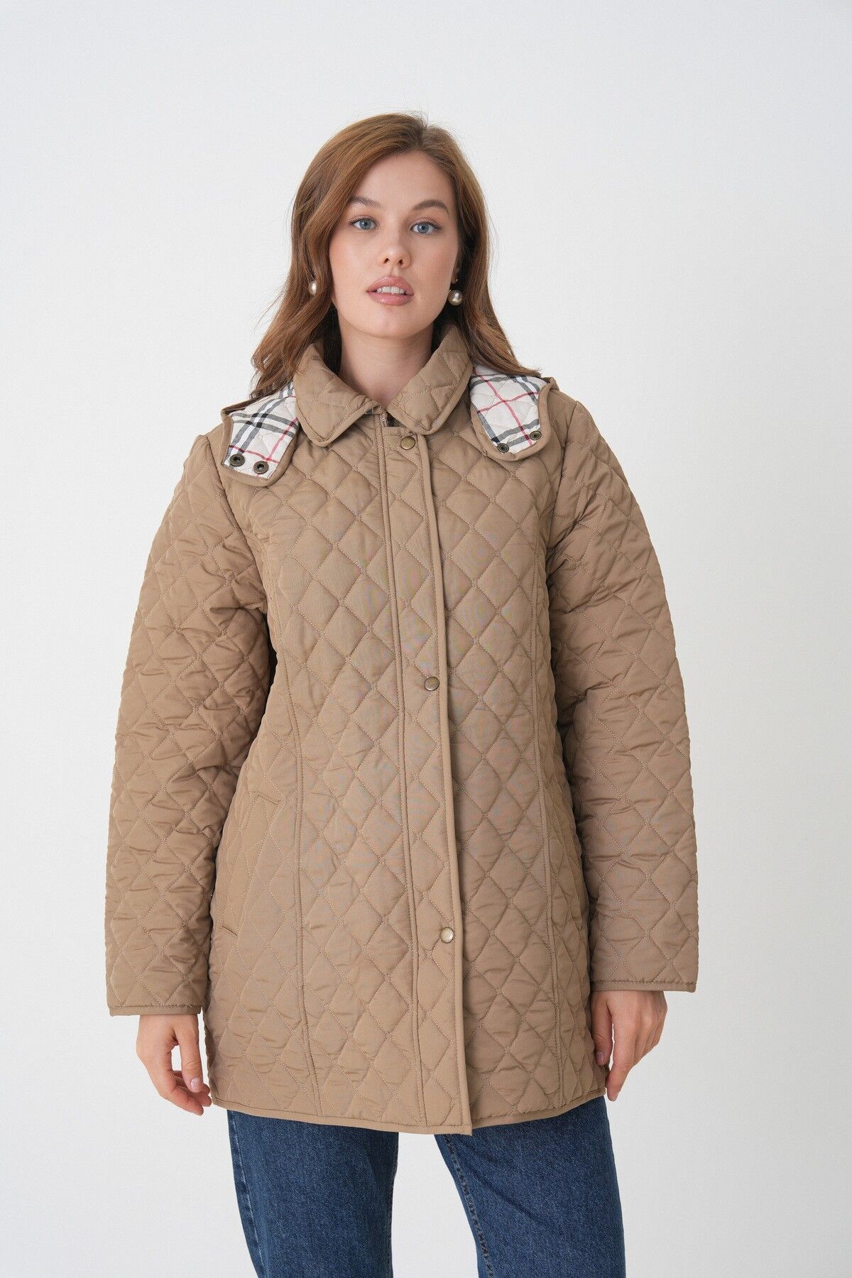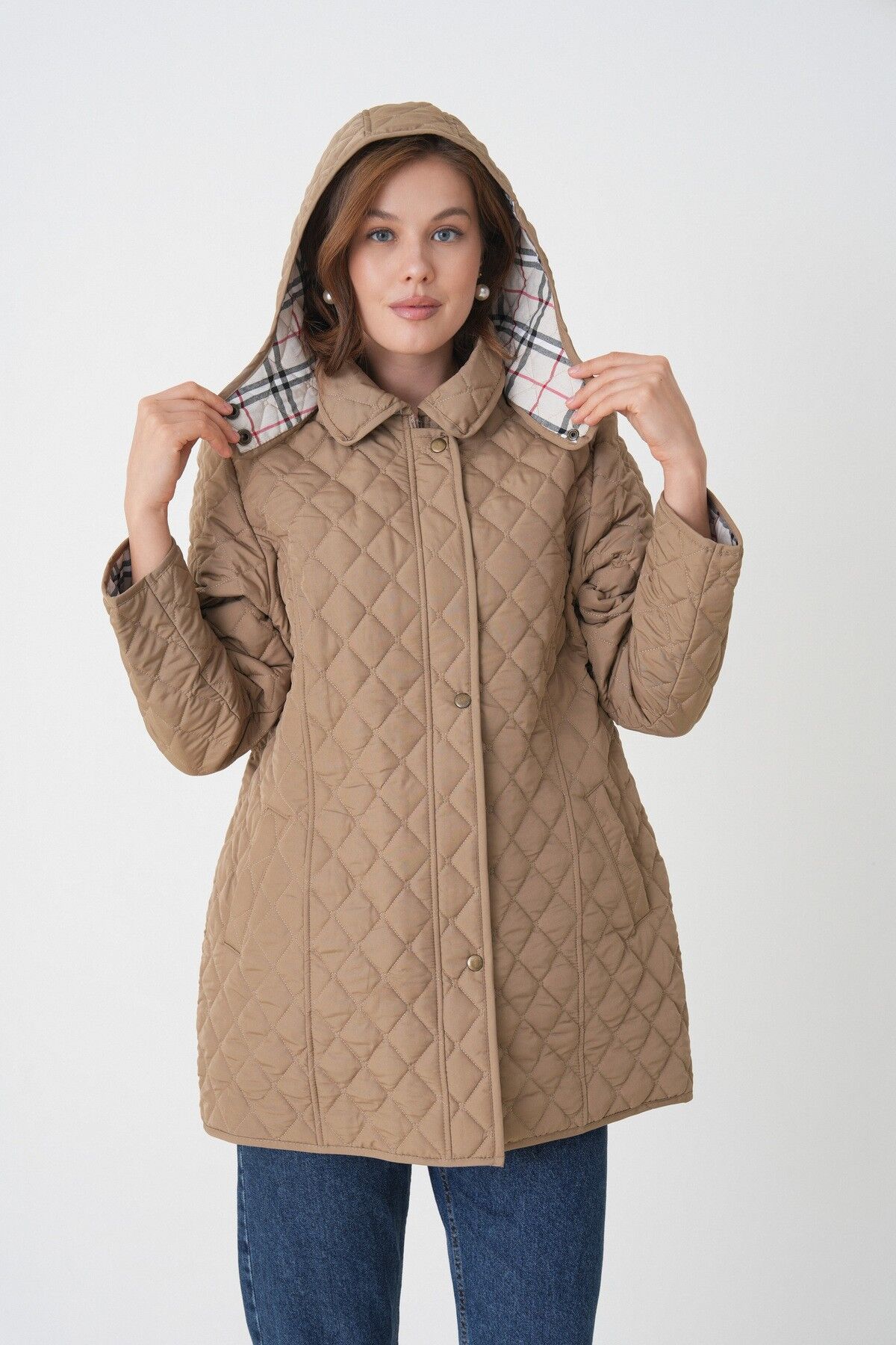 Kadın Büyük Beden Kapüşonlu Içi Ekoseli Mevsimlik Kapitone Kaban Mont- Dar Kalıp