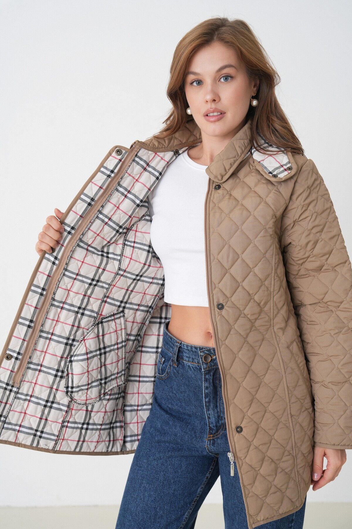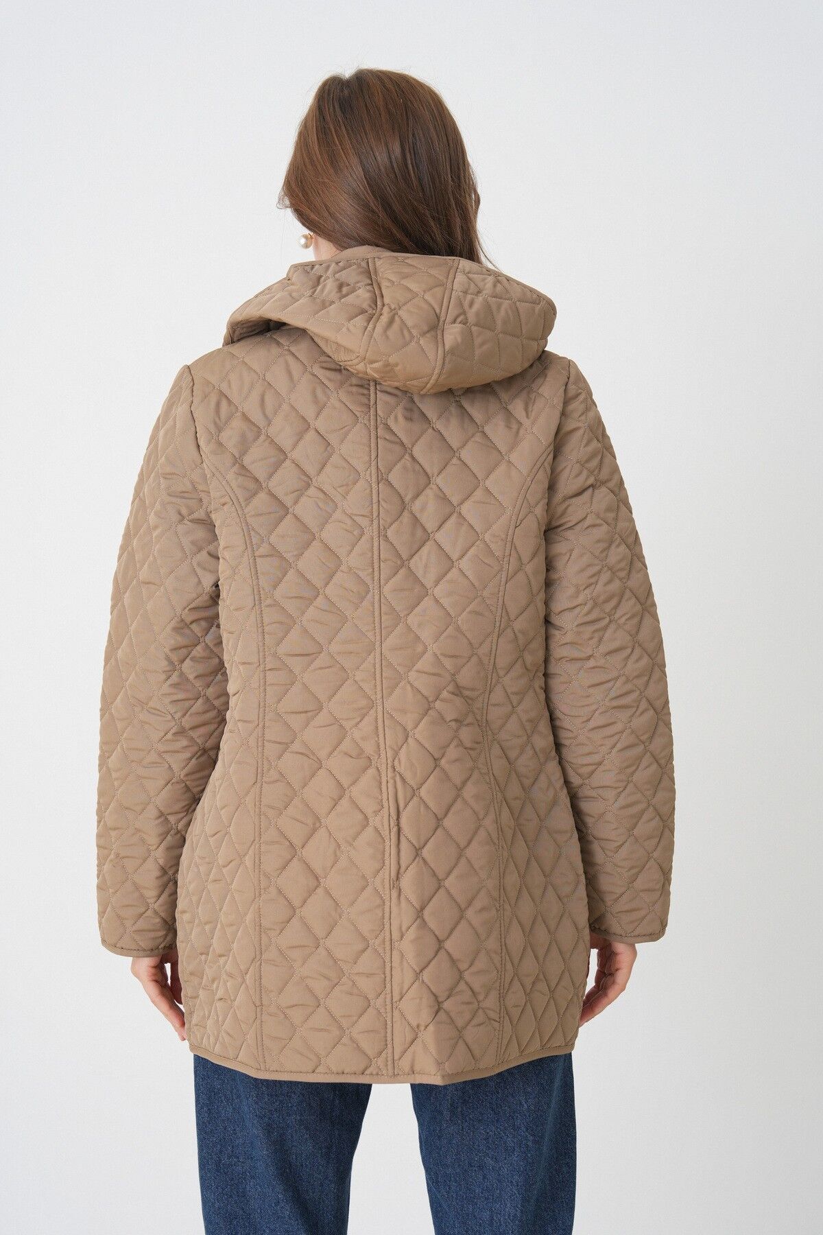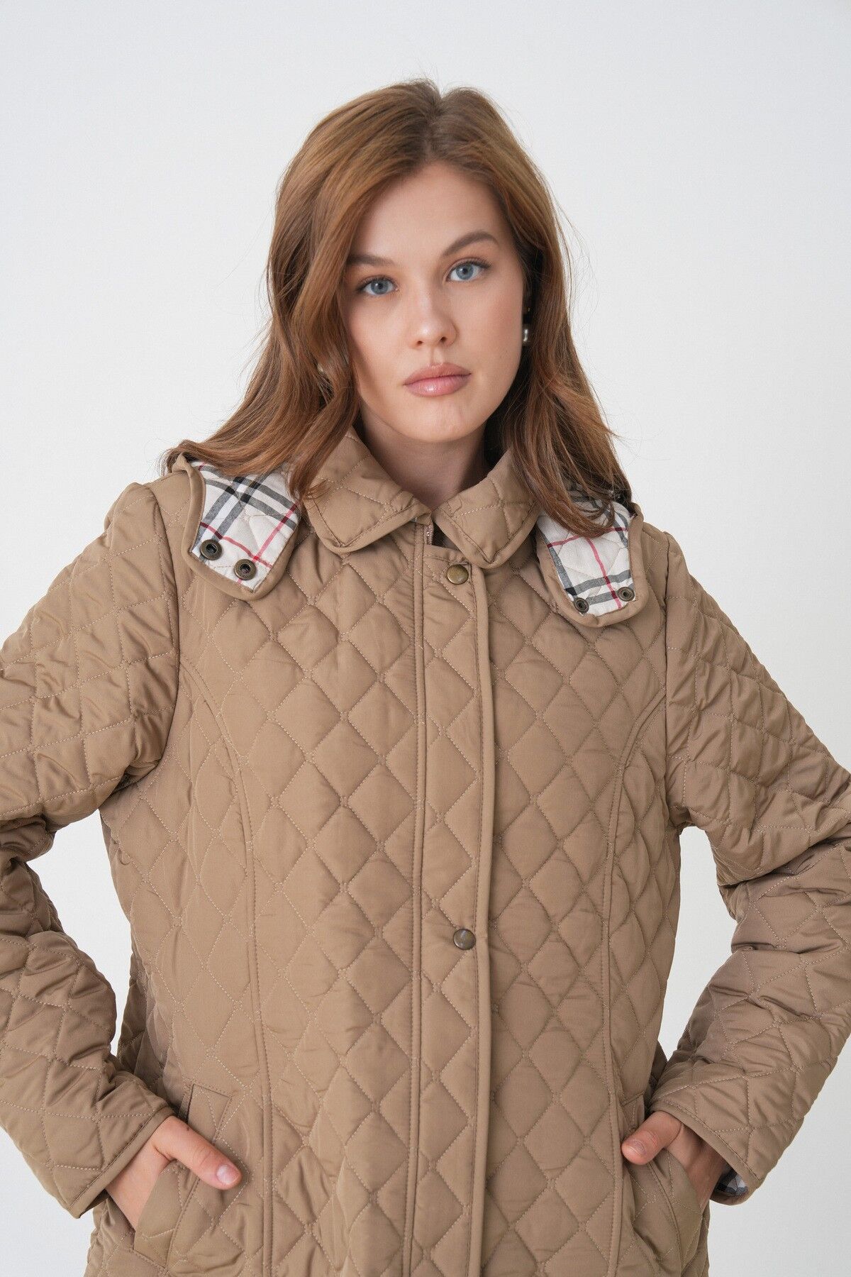 Kadın Büyük Beden Kapüşonlu Içi Ekoseli Mevsimlik Kapitone Kaban Mont- Dar Kalıp