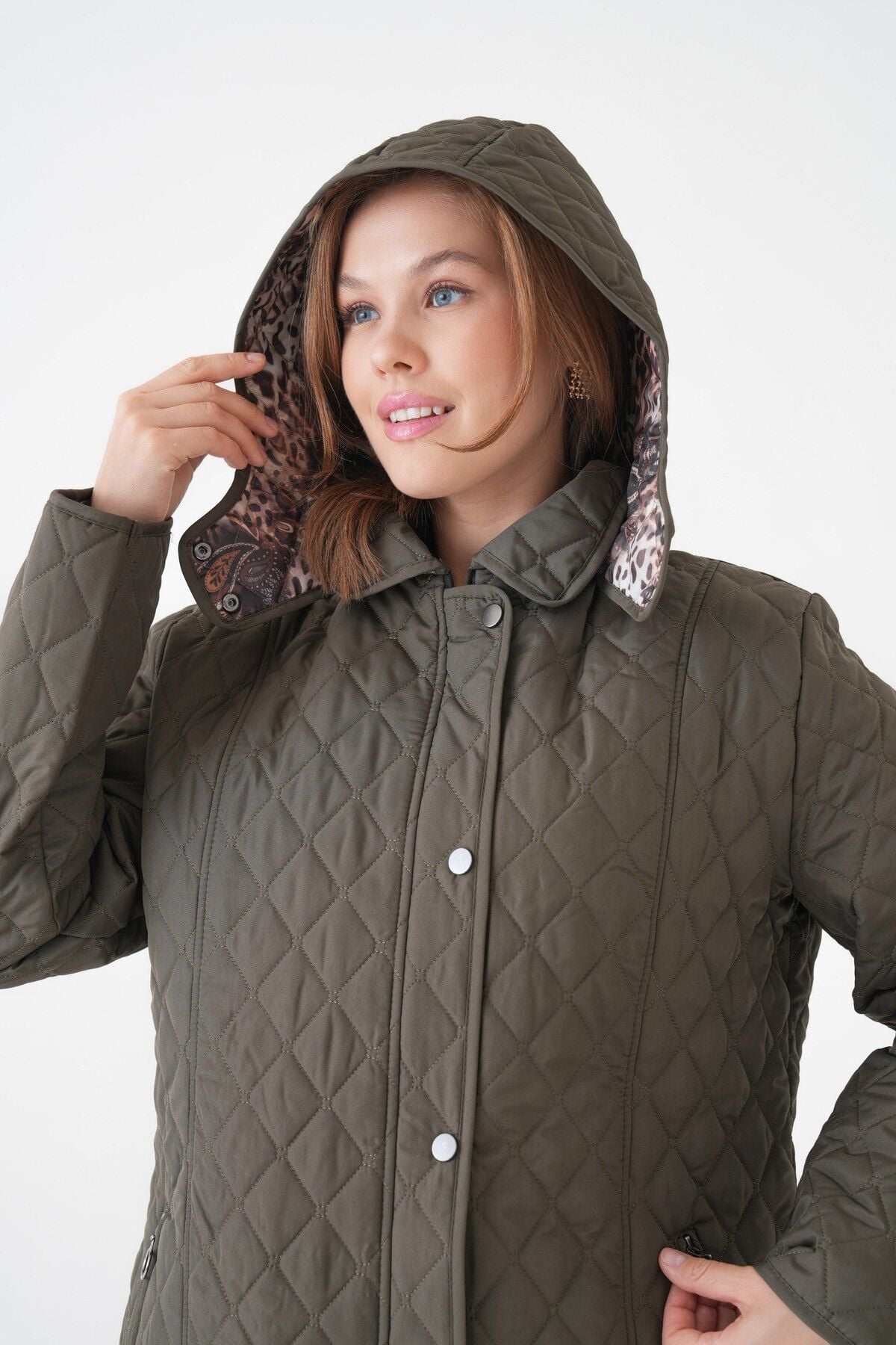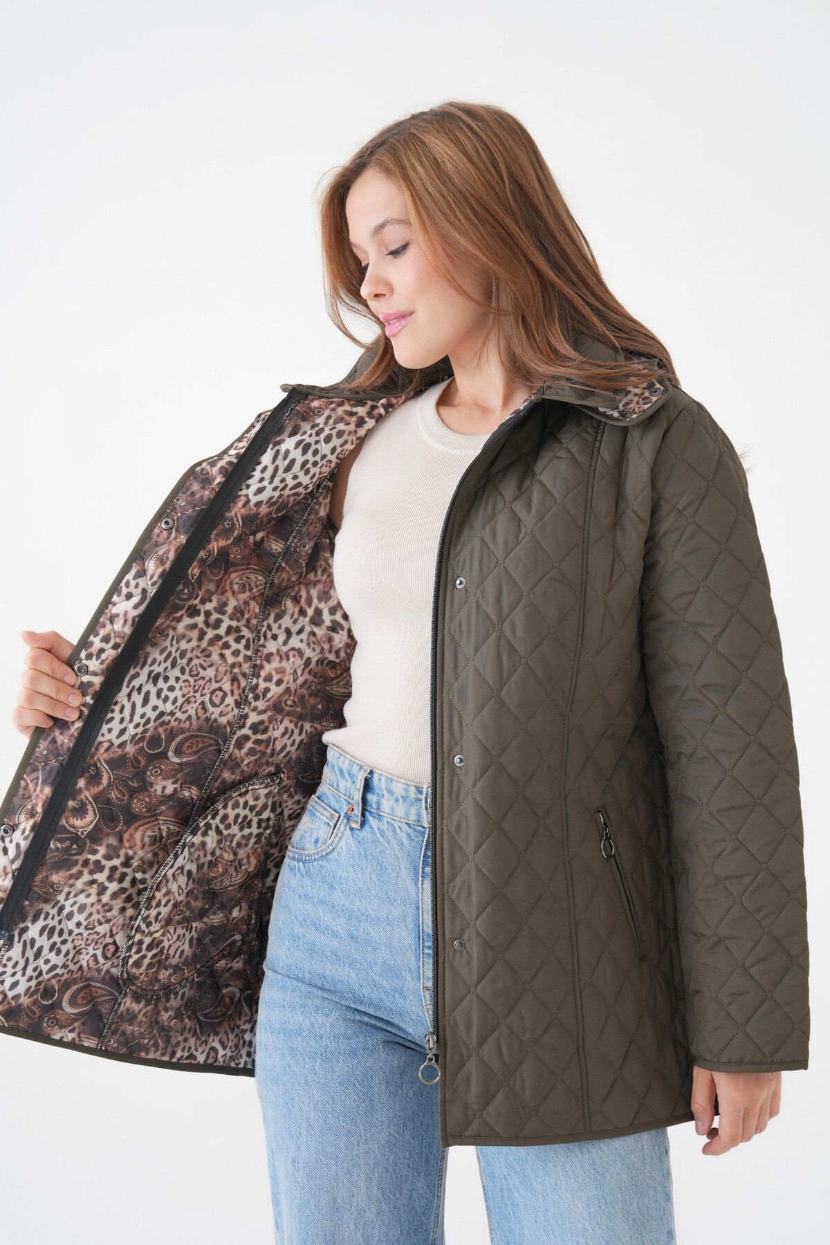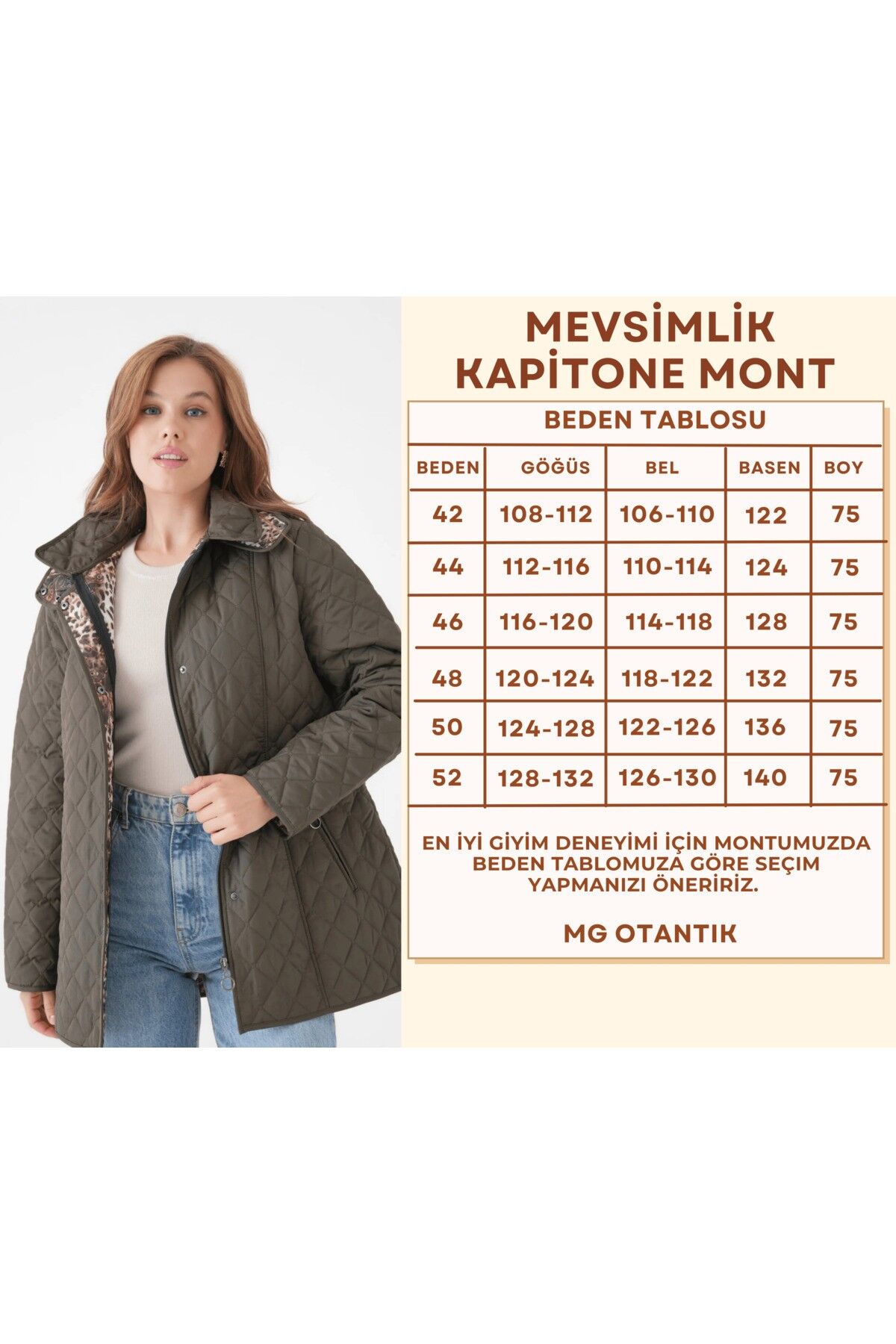 Kadın Büyük Beden Kapüşonlu Leopar Desenli Fermuarlı Çıtçıtlı Kapitone Kaban Mont