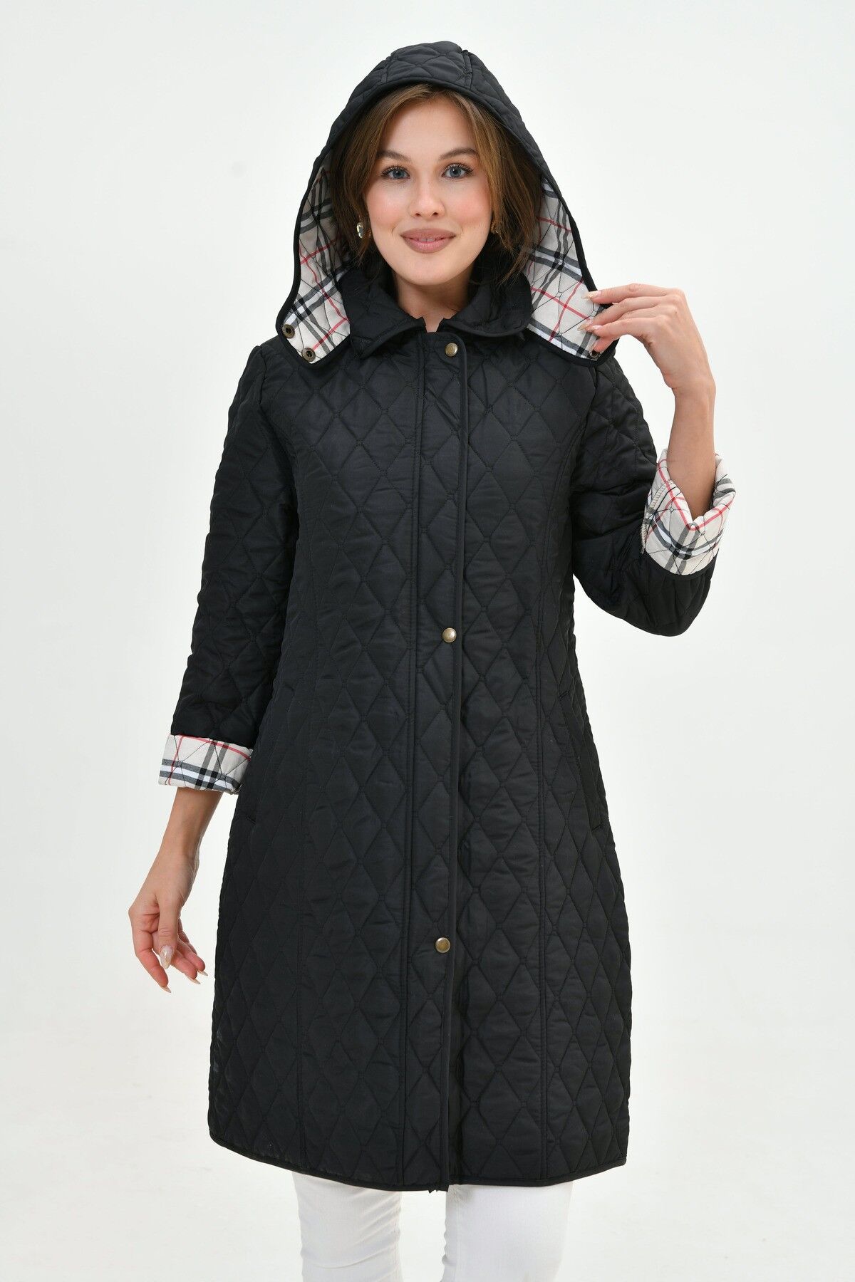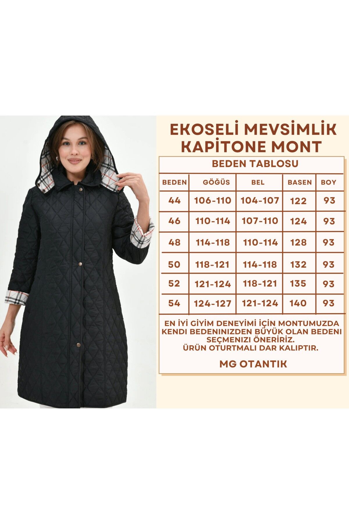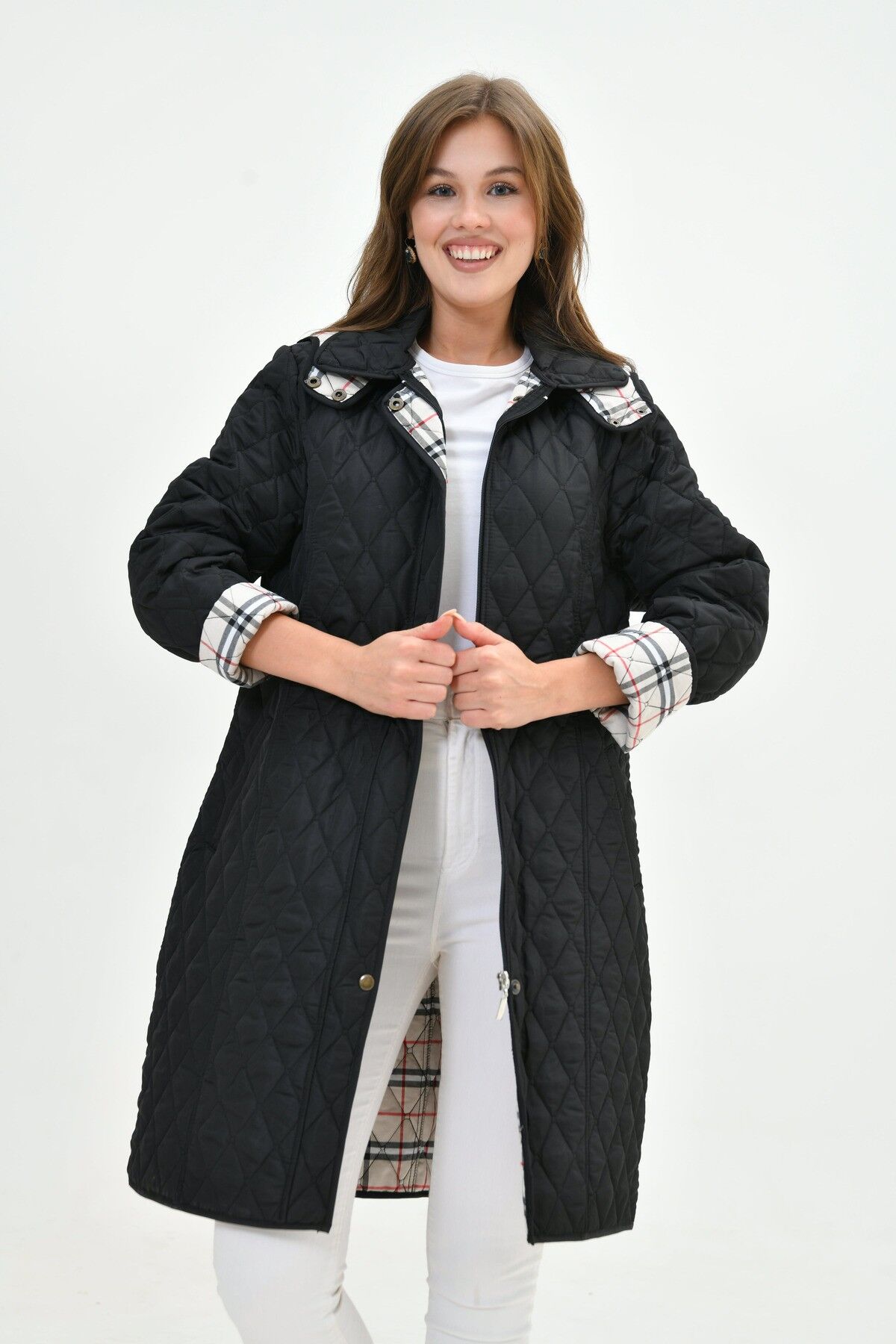 Kadın Büyük Beden Uzun Kapüşonlu Içi Ekoseli Mevsimlik Kapitone Kaban Mont -dar Kalıp