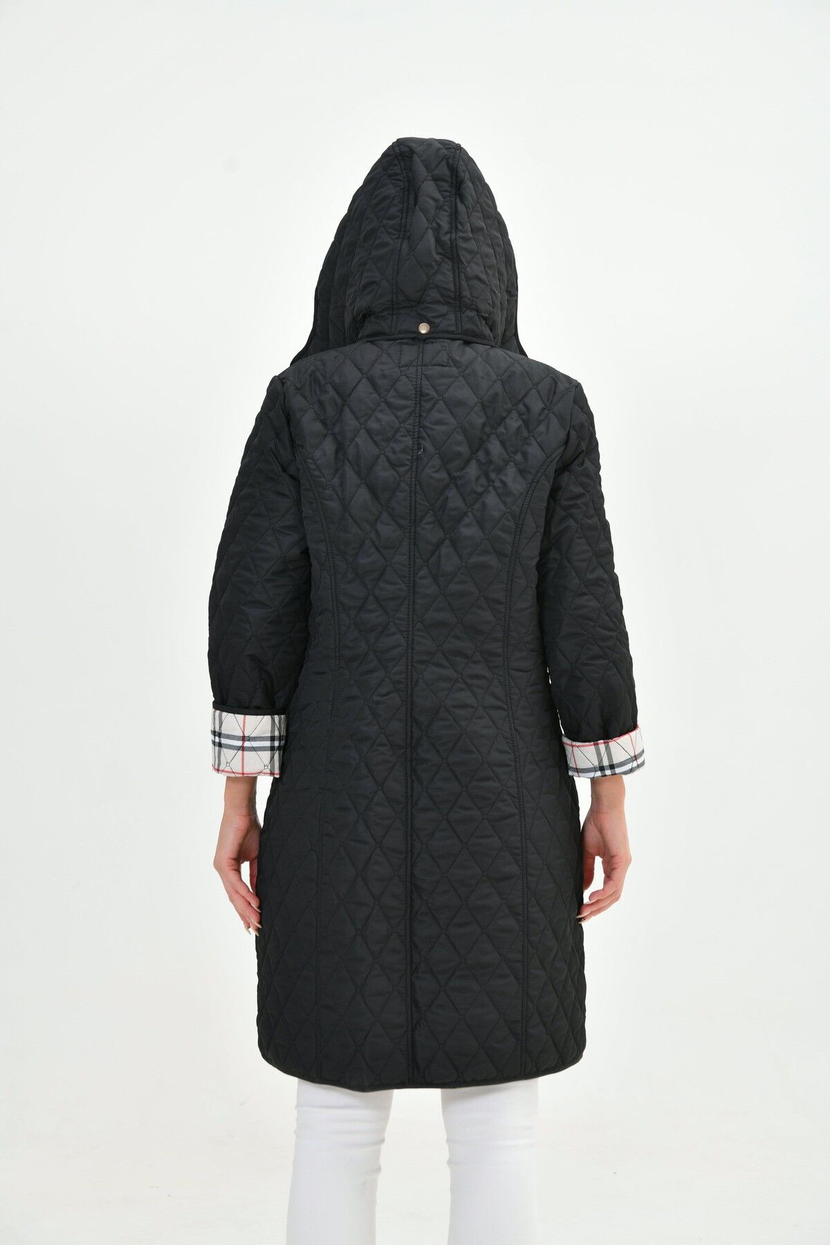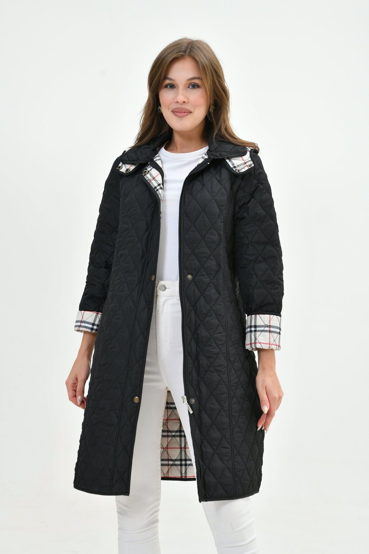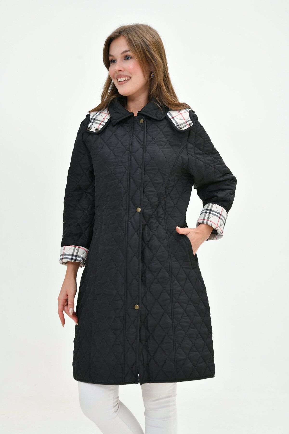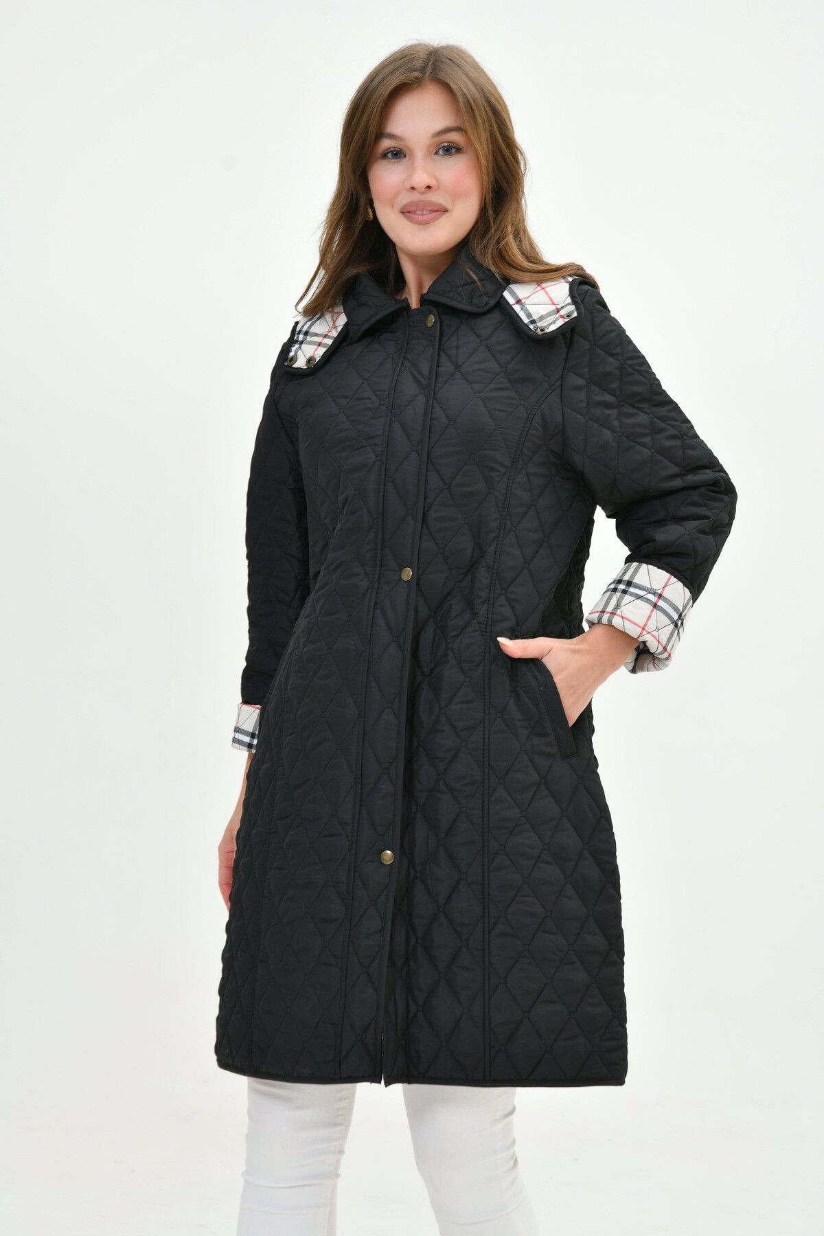 Kadın Büyük Beden Uzun Kapüşonlu Içi Ekoseli Mevsimlik Kapitone Kaban Mont -dar Kalıp
