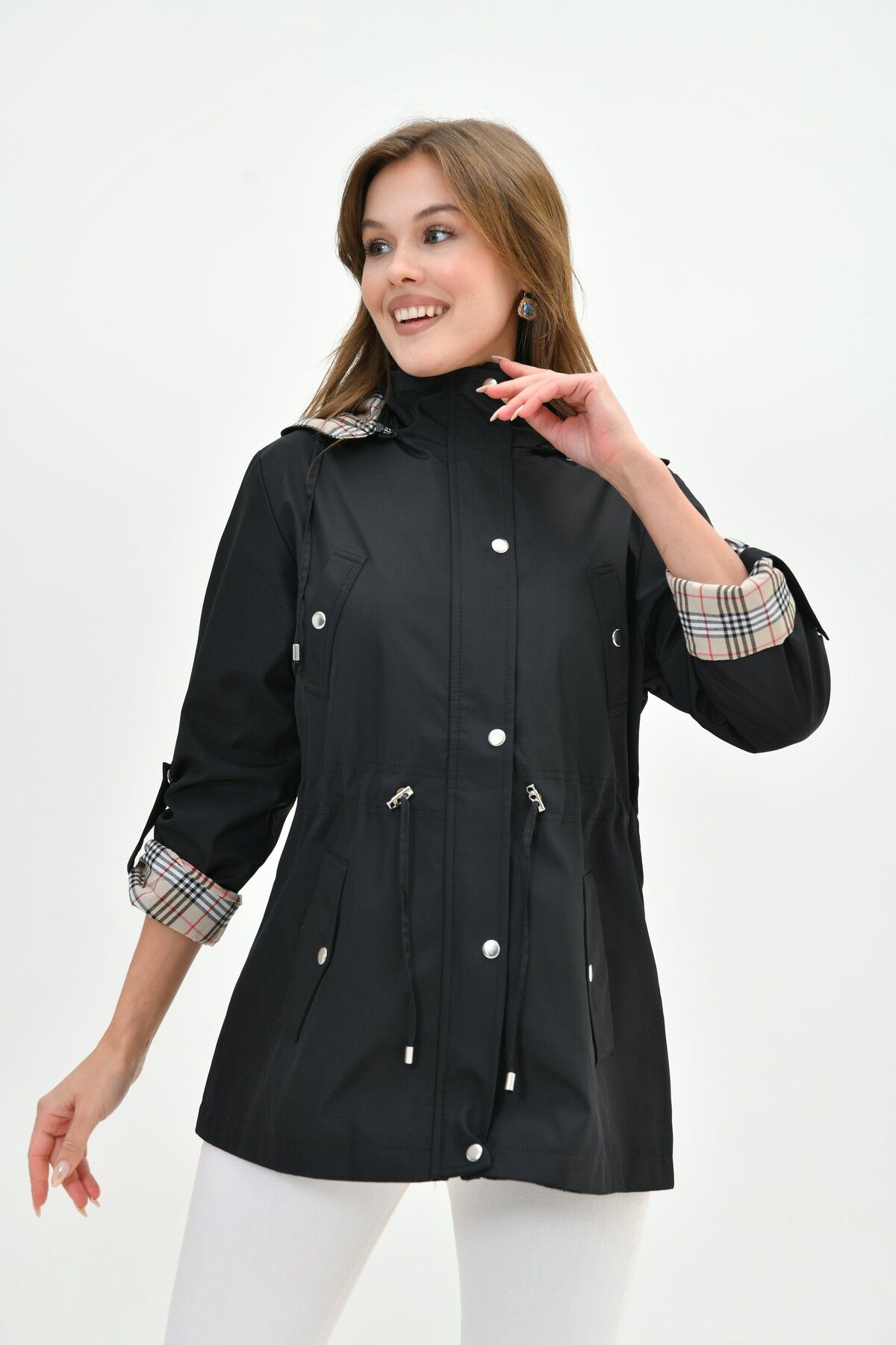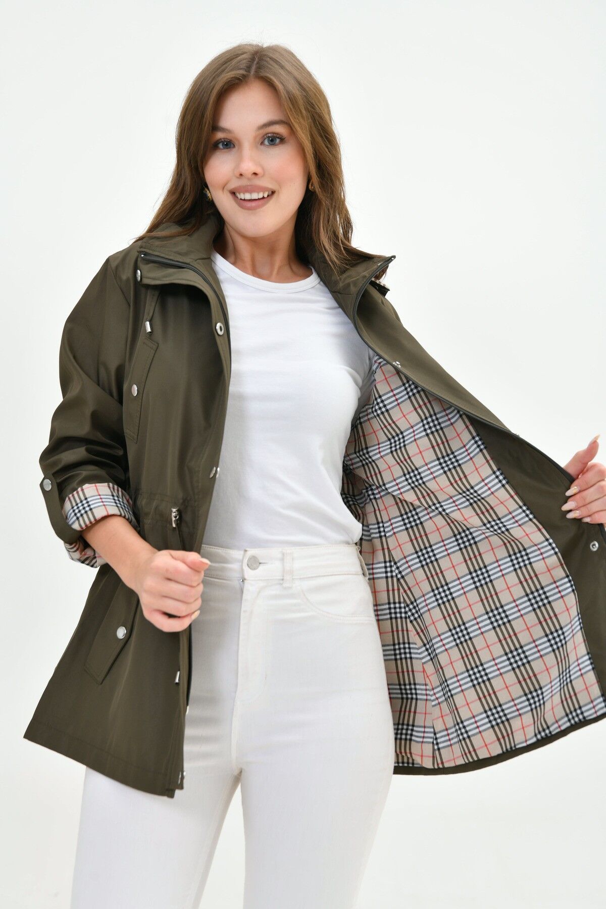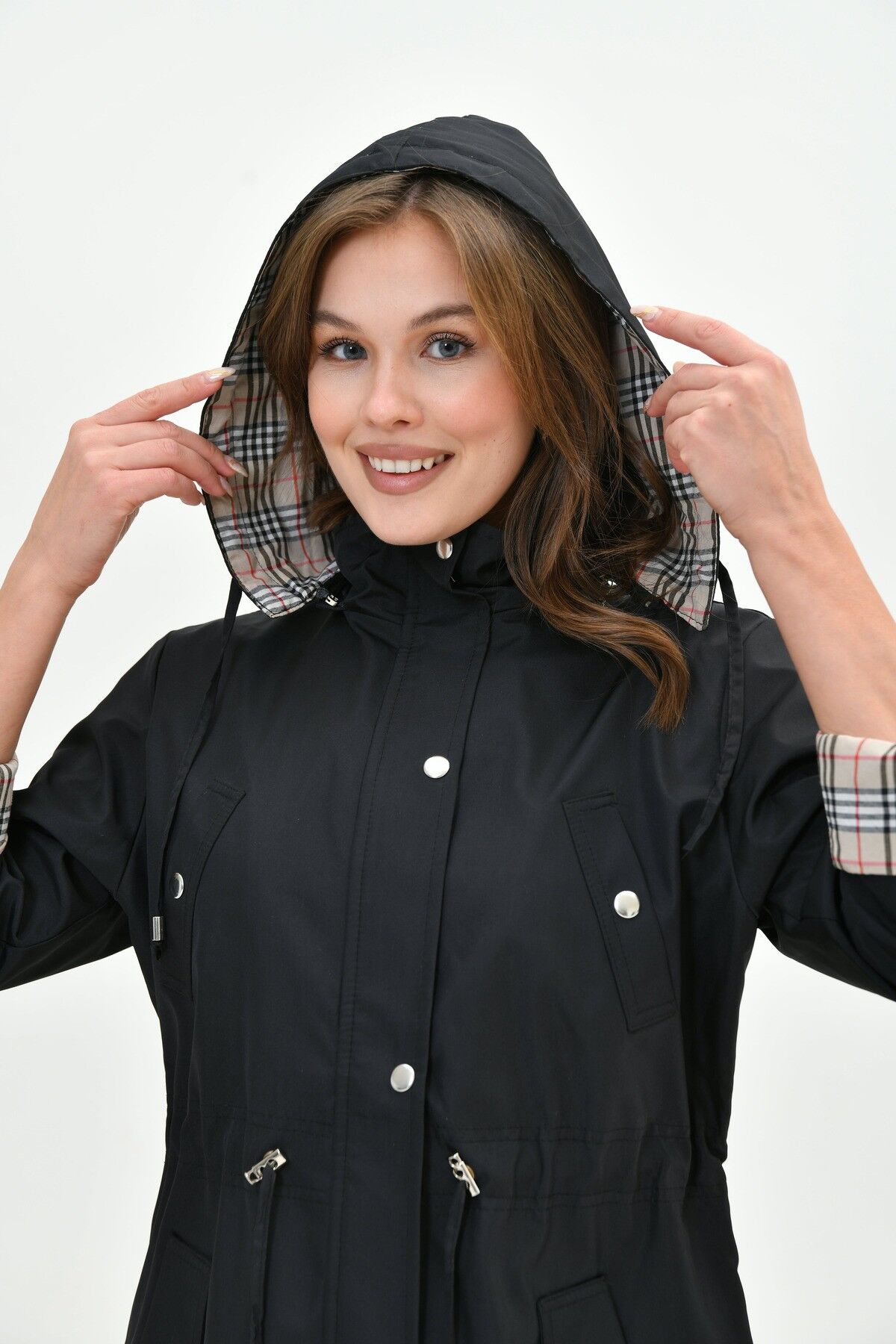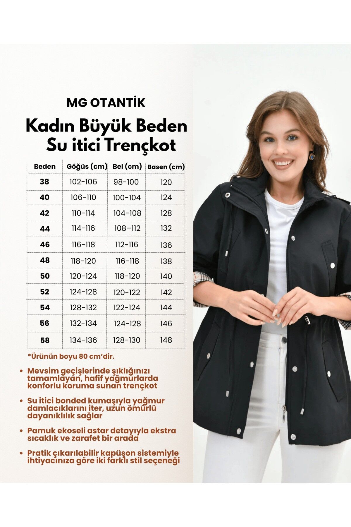 Kadın Suya Dayanıklı Büyük Beden Fermuarlı Kapüşonlu Pamuk Ekoseli Trençkot