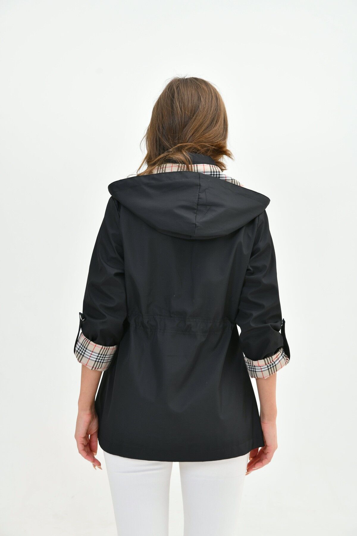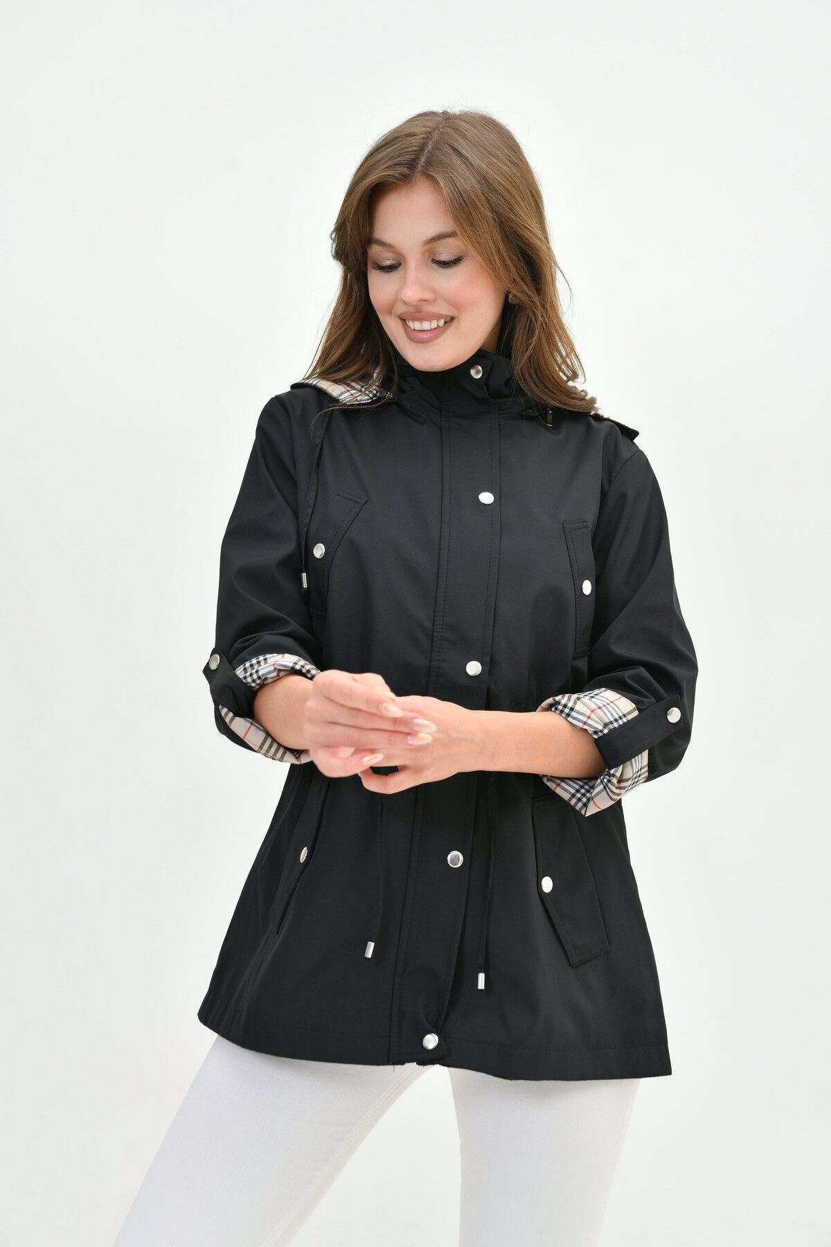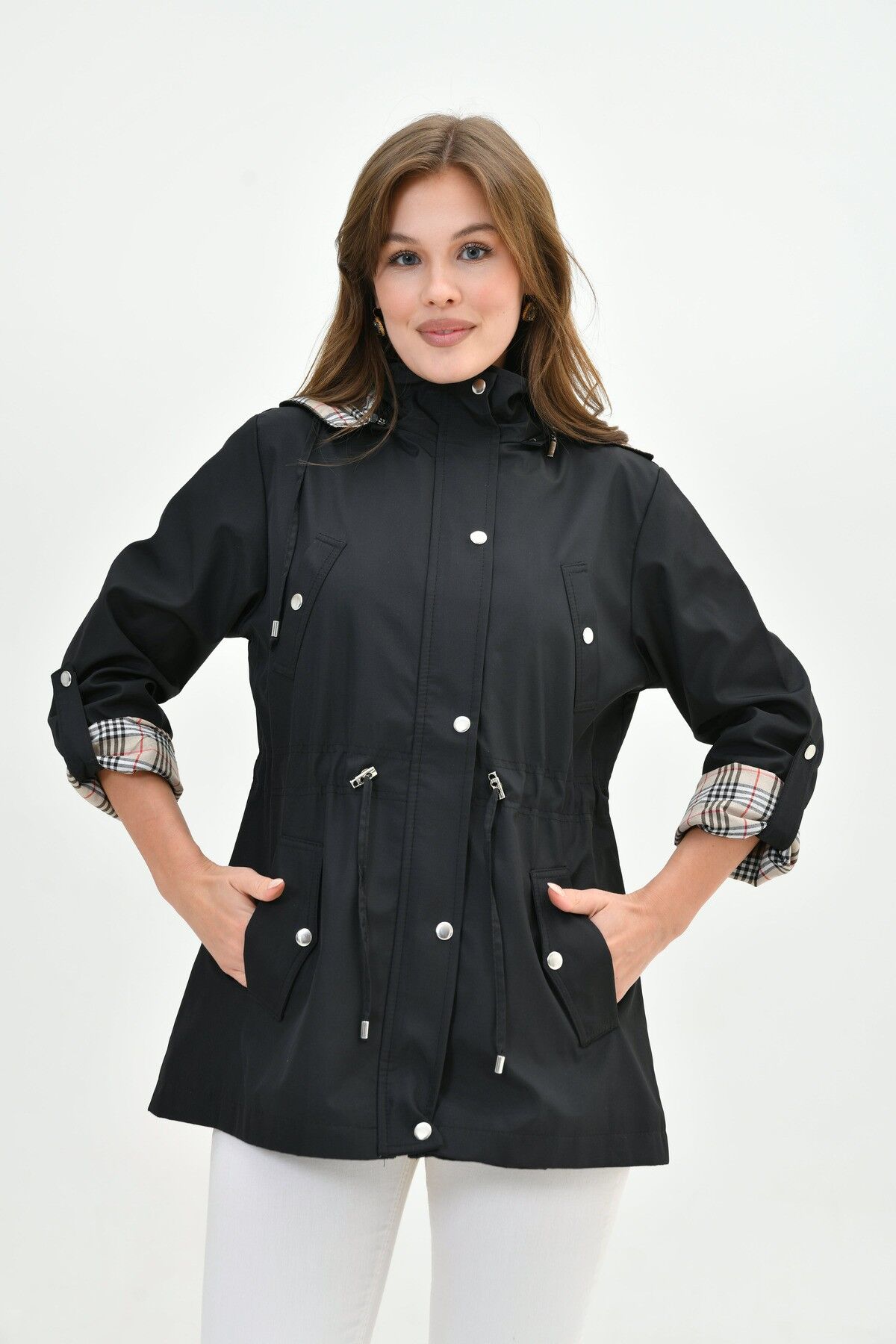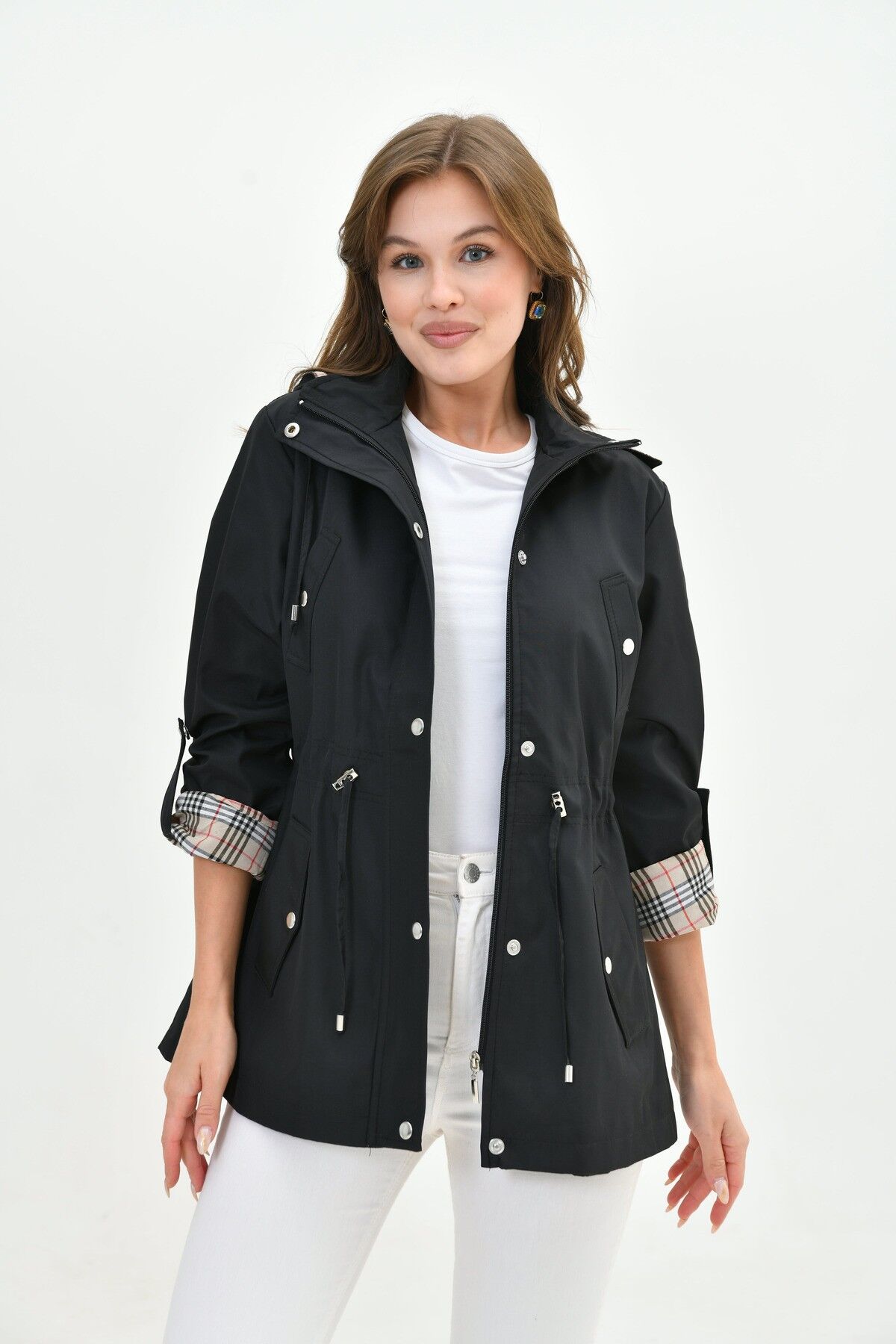 Kadın Suya Dayanıklı Büyük Beden Fermuarlı Kapüşonlu Pamuk Ekoseli Trençkot