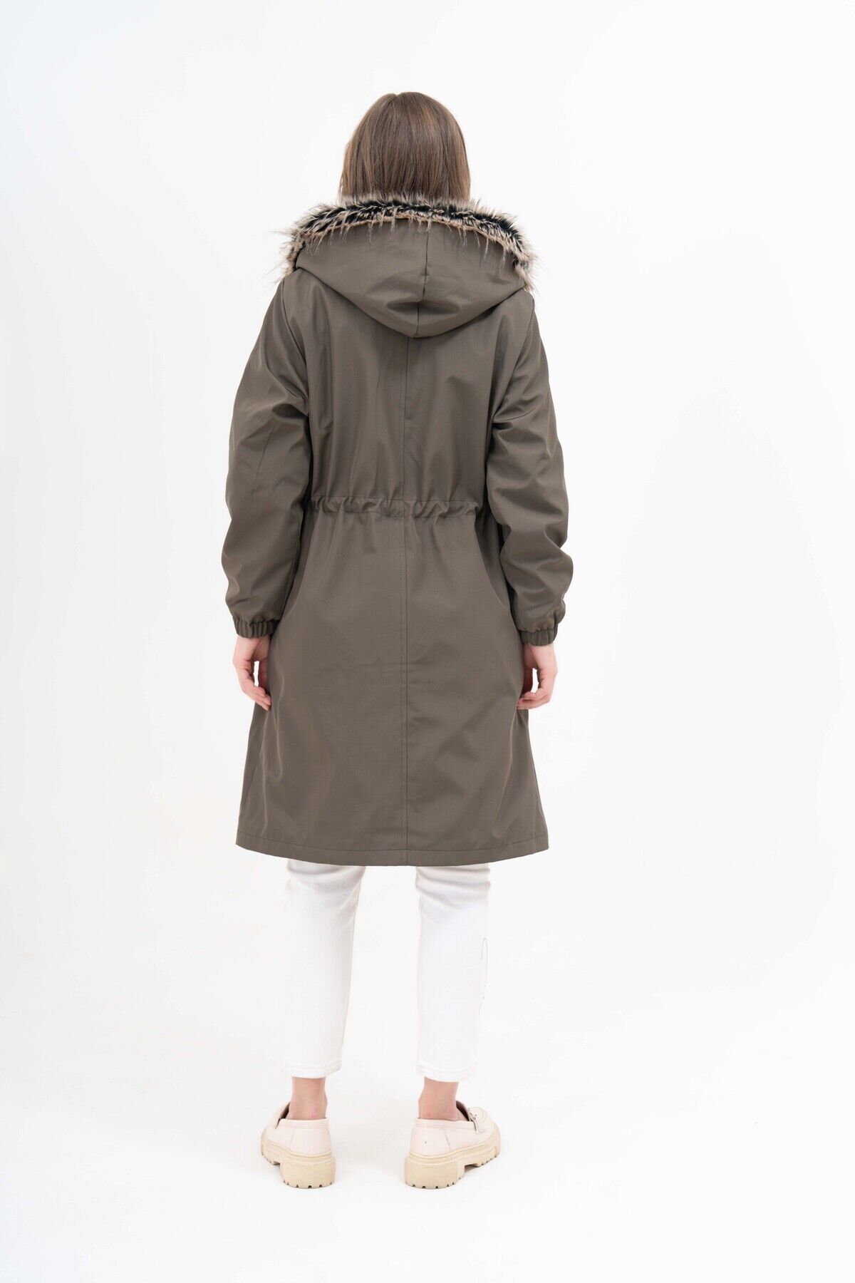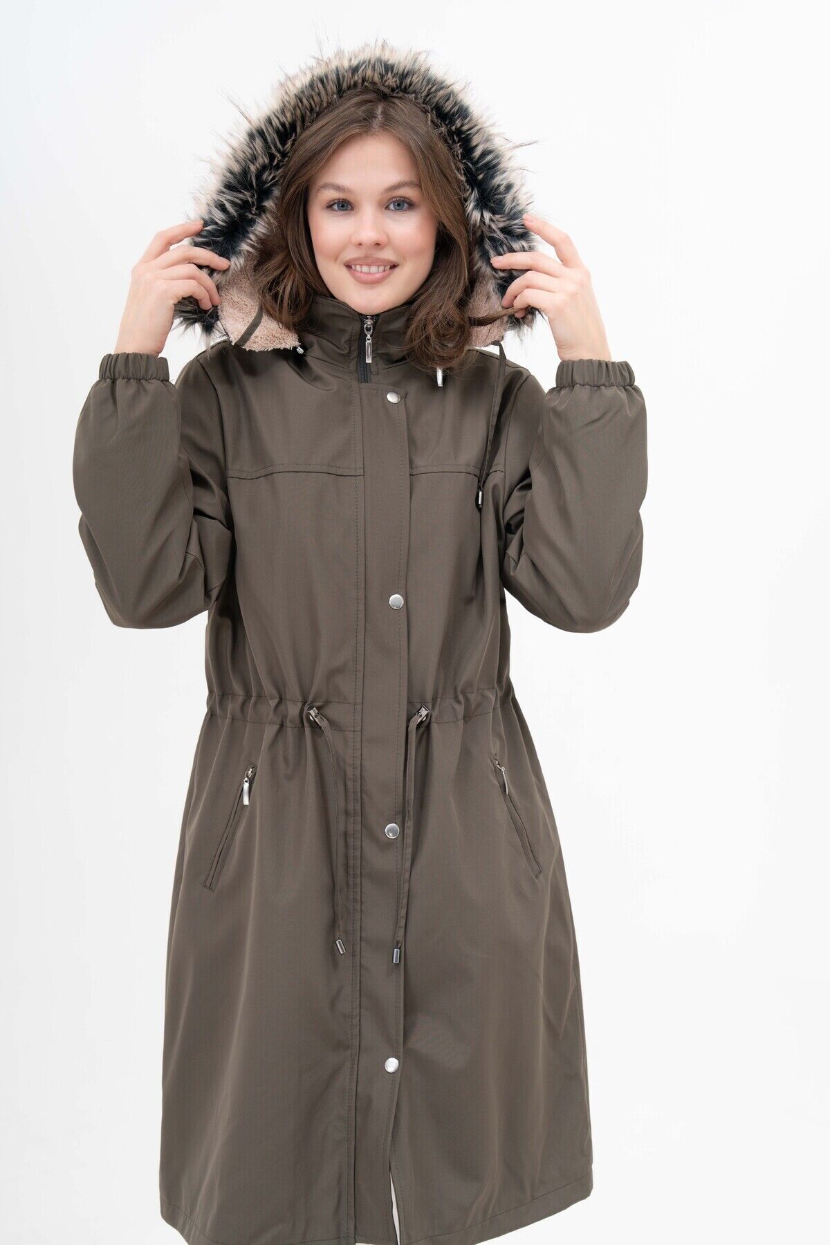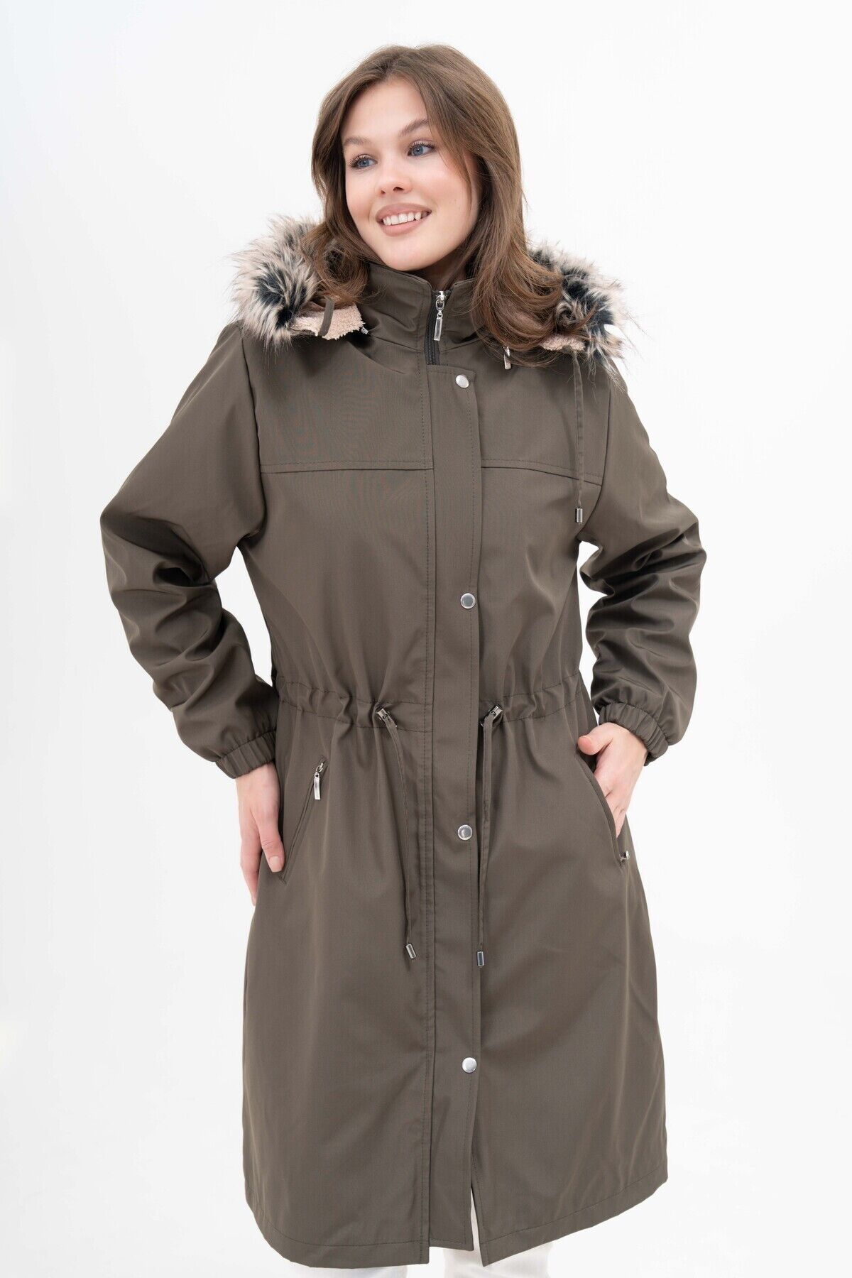 Kadın Suya Dayanıklı Büyük Beden Kapüşonlu Beli Büzgülü Uzun Içi Kürklü Kaban Mont