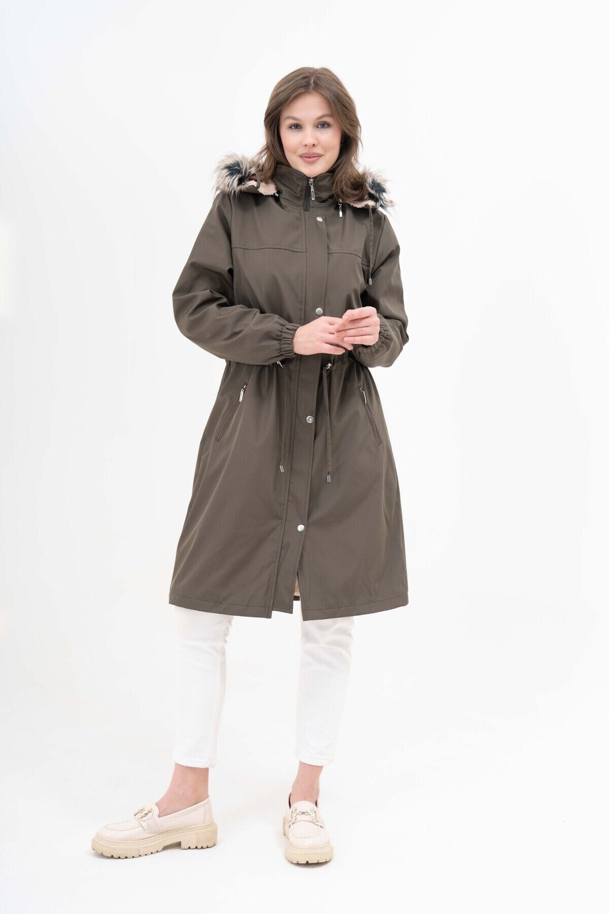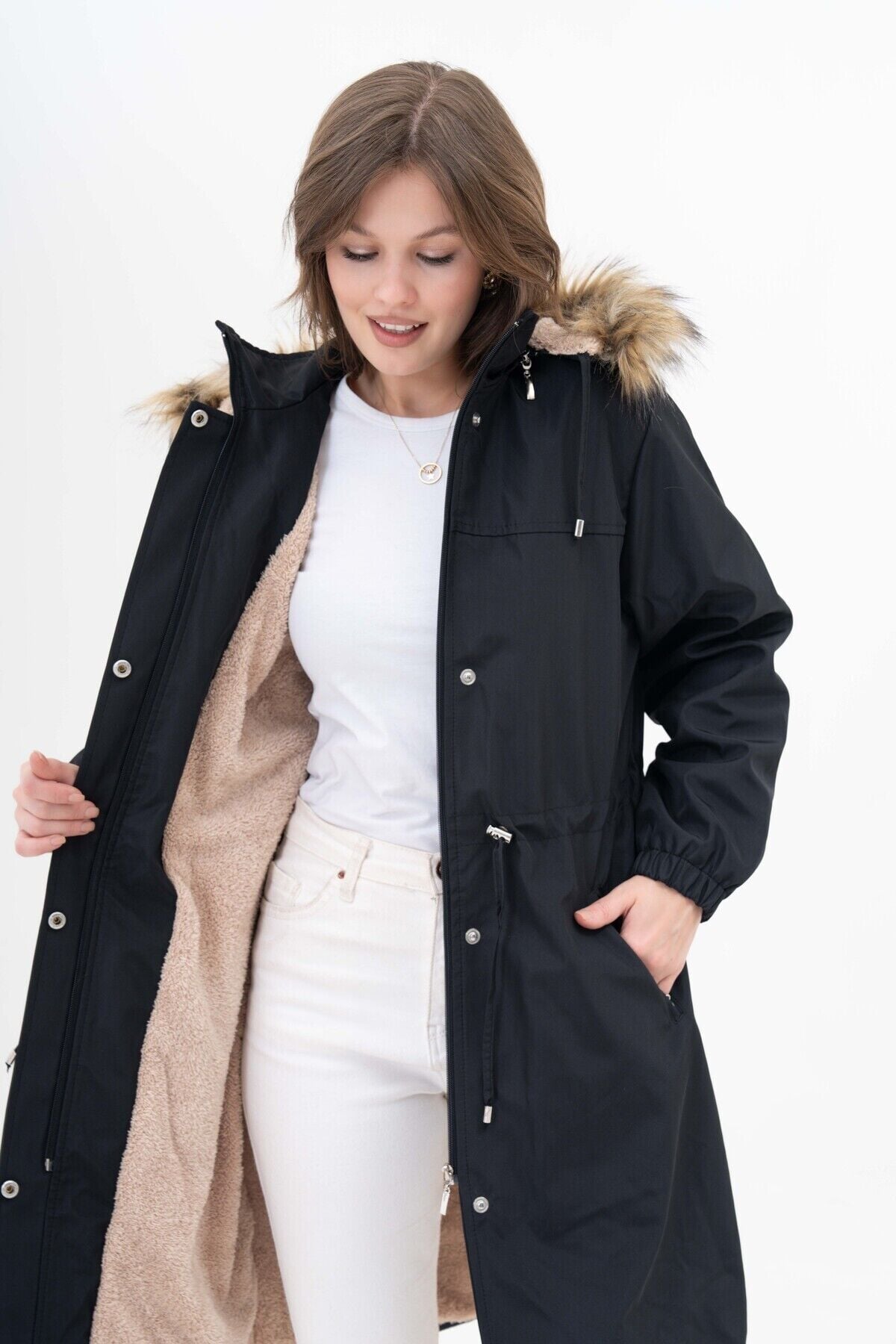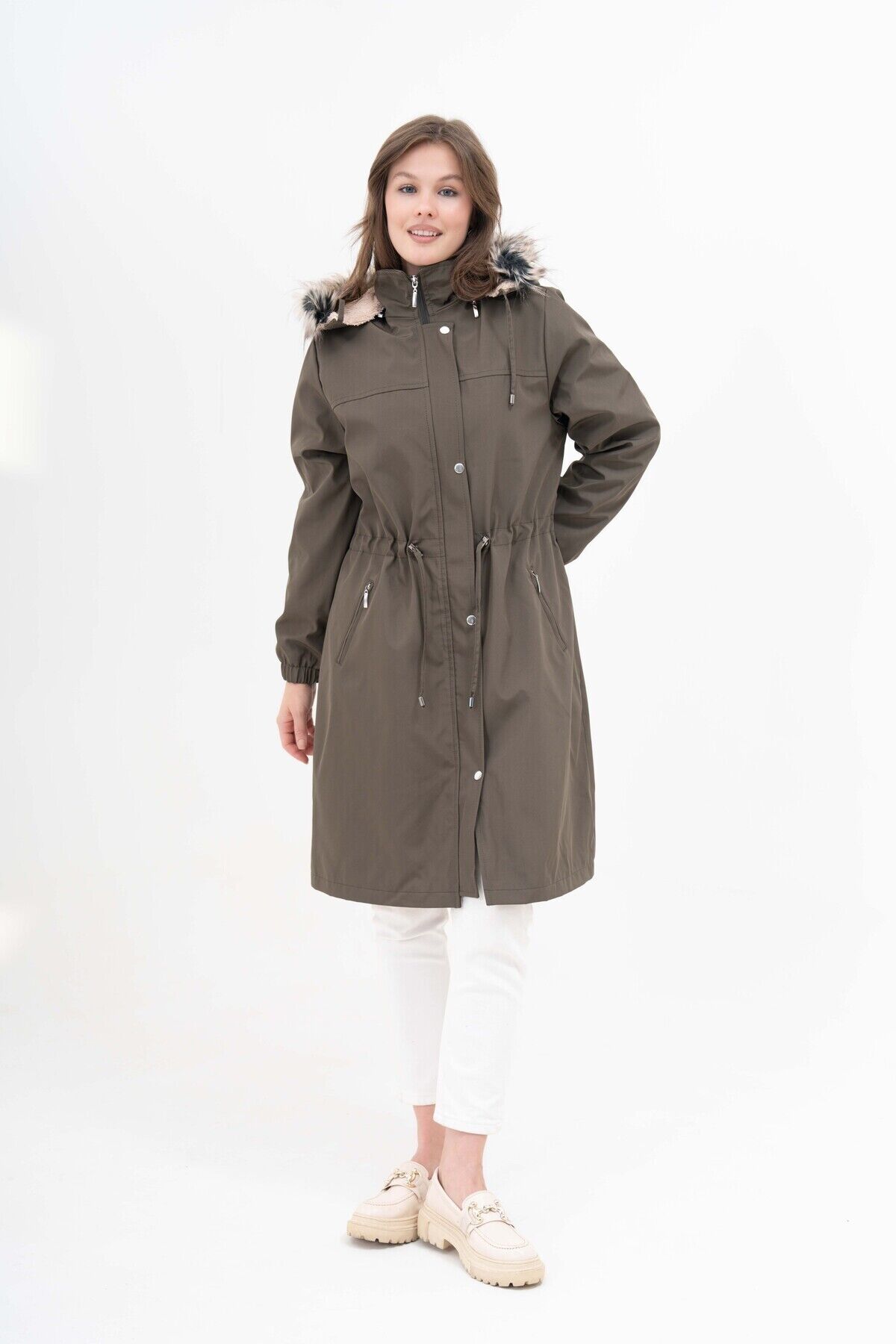 Kadın Suya Dayanıklı Büyük Beden Kapüşonlu Beli Büzgülü Uzun Içi Kürklü Kaban Mont